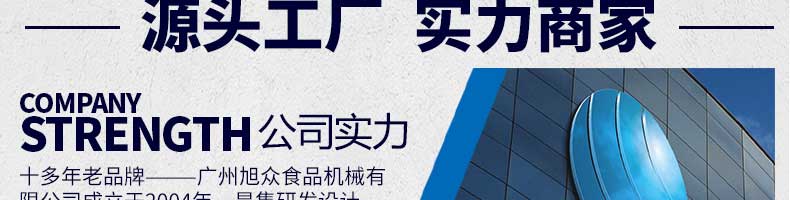 廣州旭眾食品機(jī)械有限公司是一家集科研開發(fā),生產(chǎn)設(shè)計(jì),營銷服務(wù)為一體的現(xiàn)代化生產(chǎn)企業(yè)?,F(xiàn)代化生產(chǎn)車間,精湛制造技術(shù),所產(chǎn)機(jī)械歷經(jīng)市場重重考驗(yàn),不斷贏得海內(nèi)外客戶的贊譽(yù)。