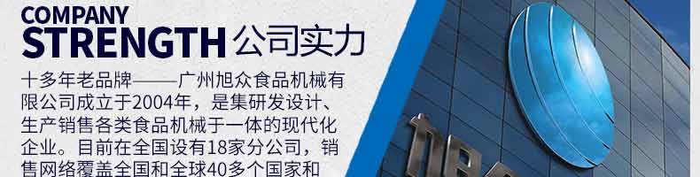 廣州旭眾食品機械有限公司是一家集科研開發(fā),生產(chǎn)設(shè)計,營銷服務(wù)為一體的現(xiàn)代化生產(chǎn)企業(yè)?,F(xiàn)代化生產(chǎn)車間,精湛制造技術(shù),所產(chǎn)機械歷經(jīng)市場重重考驗,不斷贏得海內(nèi)外客戶的贊譽。
