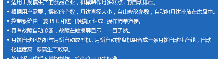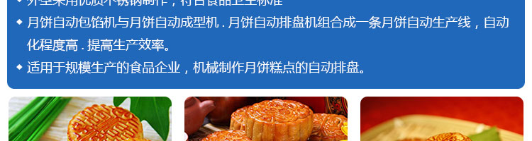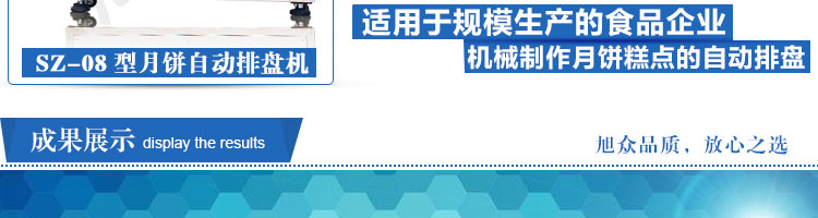 SZ-08型月餅自動排盤機,可同于制作各種月餅。適用于蛋糕房、休閑食品廠、食品加工產(chǎn)、面包房、月餅加工廠、超市、學(xué)校、食堂等各種工作場所??蓾M足不同客戶群體。免費提供工藝技術(shù)。