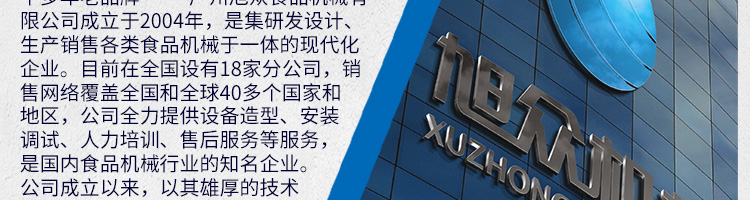 廣州旭眾食品機(jī)械有限公司是一家集科研開發(fā),生產(chǎn)設(shè)計,營銷服務(wù)為一體的現(xiàn)代化生產(chǎn)企業(yè)?,F(xiàn)代化生產(chǎn)車間,精湛制造技術(shù),所產(chǎn)機(jī)械歷經(jīng)市場重重考驗,不斷贏得海內(nèi)外客戶的贊譽(yù)。